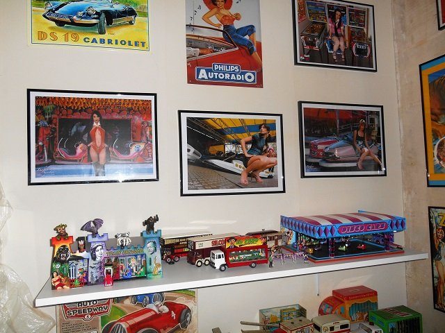 A la fin de cette série, vous en verrez 3 imprimées et encadrées au-dessus de l'étagère accueillant mes maquettes foraines (en haut à droite sur la photo, un montage de la série "pinball pin-ups" consacrée aux flippers). J'avoue être content du résultat