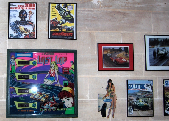 Dernière petite chose : au-dessus du circuit, notez une très rare glace de flipper espagnol des années 70 sur le thème du Slot, le Last Lap, rarissime en parfait état. J’ai monté un éclairage derrière qui en fait clignoter les parties transparentes (les voitures et les gonzesses). Je la branche quand on joue les soirs de vacances dans le noir, avec quelques néons d’ambiance :vip: . Je vous ai mis la dernière photo pour vous montrer mon petit burlingue derrière le circuit, où j’aime peinturer et bidouiller mes maquettes et figurines.
