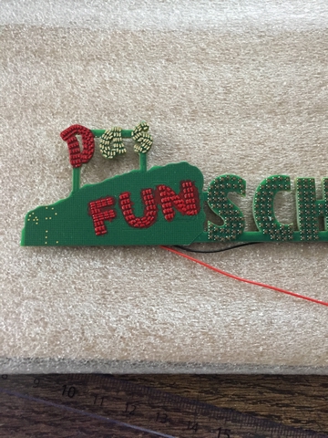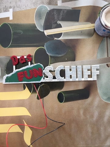 salut à tous une petite avancée sur le das fun schiff , peinture des mots " das fun " en rouge et découpage de l'autocollant " fun" je pense qu'il faudra que je réajuste la découpe pour que cela s'insère correctement ...