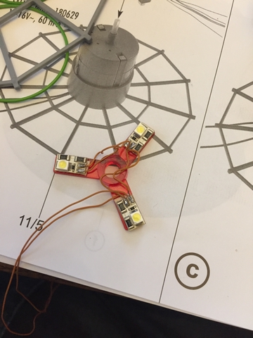 Salut à tous , la suite du montage du manège de chevaux de bois , après la pause des autocollants sur les panneaux centraux , ceux ci sont installé au centre tout autour , installation de trois leds blanches pour éclairer le centre , j'ai installé un contact glissant au centre et dans le haut du toit , après test il n'y a pas l'air d'avoir de sautes de continuité , mise en place des ronds rouges sur la partie extérieur des frontons et pour finir , pose des autocollants sur la feuille de vitre et découpage pour une meilleure rigidité...........la suite au prochain épisode