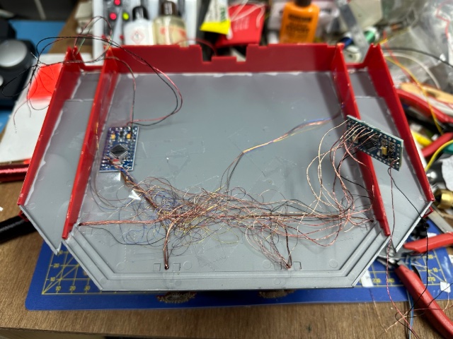 Salut à tous , installation des 4 poteaux avants , bon ……encore un sacré paquet de fils à planquer sous le plancher et à raccorder aux différentes cartes arduino