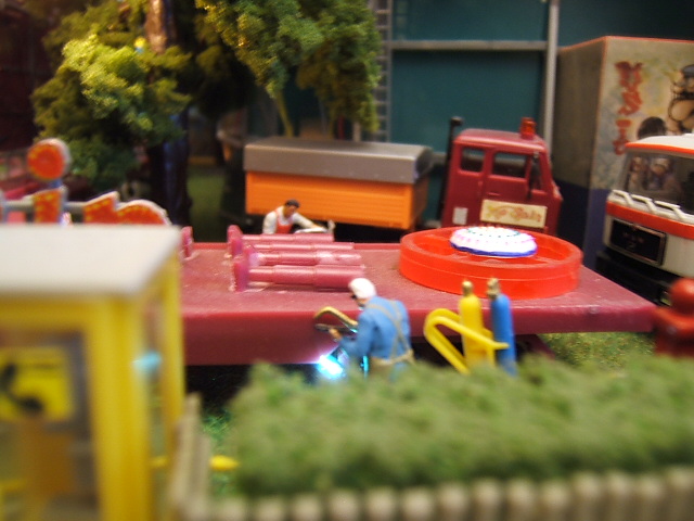 Salut Mog, effectivement c'est un conteneur poubelle de chez Preiser. Il en existe en différentes couleurs et c'est naturellement un détail important sur un diorama. Une autre photo avec cet élément. (au premier plan.) Si tu regardes bien, il y a même des morceaux qui dépassent du conteneur.mog666 a écrit :Les détails sont surprenant , c'est vrai que sur les champs de foire, il y a toujours une multitude de tuyaux et de câbles électriques au sol .... C'est le genre de détail qui peut rendre tres réaliste un diorama ... A Gauche on apercevrait pas un petit container poubelle jaune de chez PREISER ???Là aussi ce sont des petits éléments qui augmentent le réalisme de la maquette ...