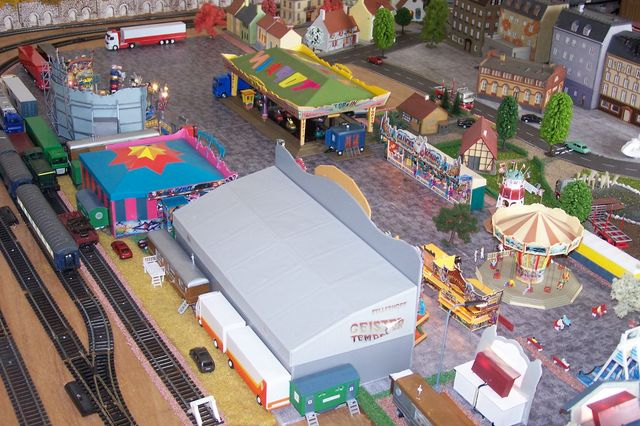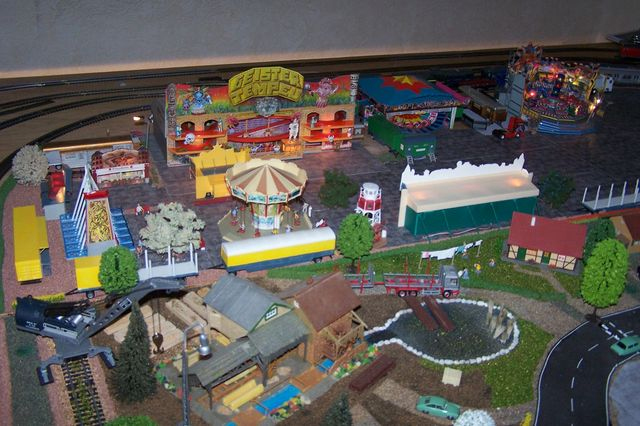 voici d'autres photos pas évident d'insèrer la fete avec mon reseau ferroviaire mais on y arrive au fur et à mesure la fete s'installe sur la place et en plus il y a le son !!!!!
