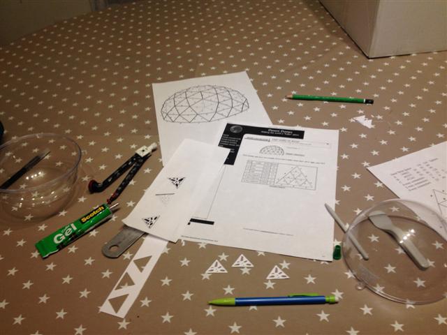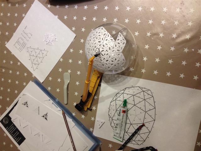 J'ai donc fait quelques recherches pour tenter de la reproduire. Je vais donc prendre une boule en plastique transparente et avec des calculateurs de domes, je tente la production de triangles que je colle sur la boule.