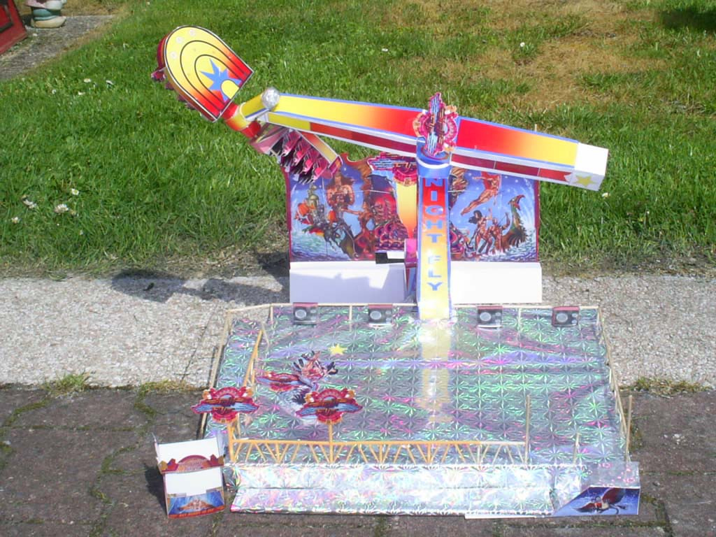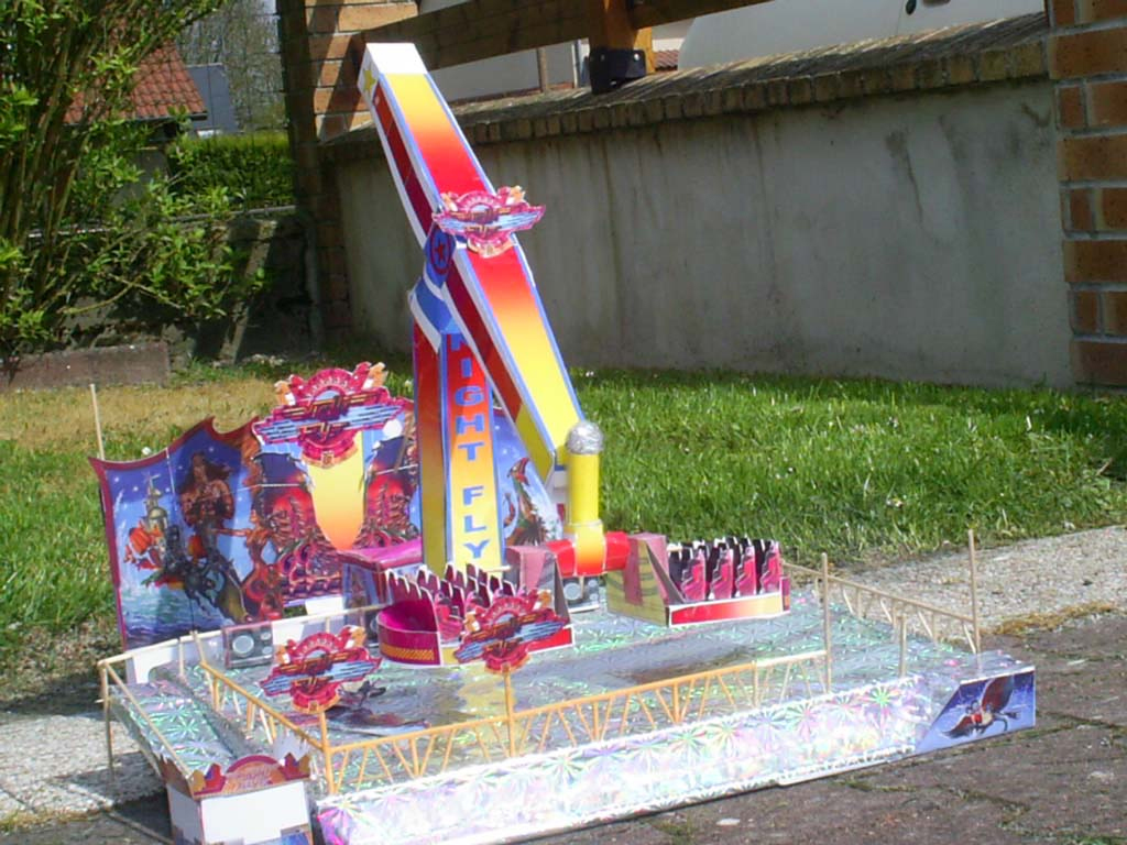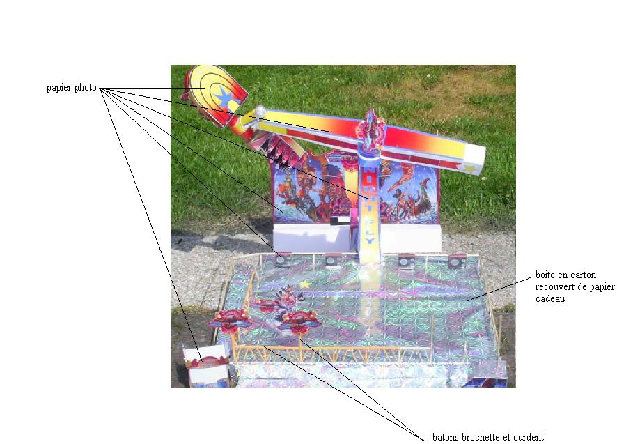 le pilier, les nacelles, les décos sont faits avec du papier photo. les assemblages sont solidifiés pour les rotations par des batons à brochettes.