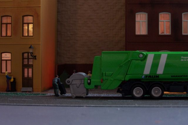 passons l'affreux moment du pupitre, voici une scéne quotidienne de la vie ramassage des ordures, shopping et cinéma plus éclairage mis dans les maisons voilà c'est repartit