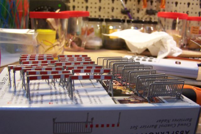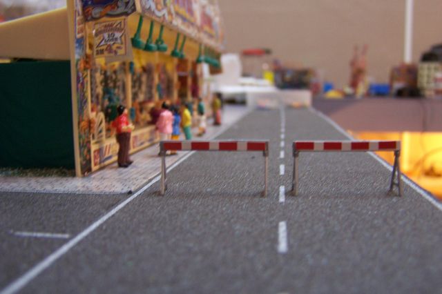 moi j'ai pas d'employé :evil: par contre voilà toutes les barrières montées une à une plus découpage des bandes et collage , les 2 premières posées pour interdire l'accès aux véhicules pendant la fête :nananere: :nananere: