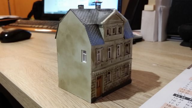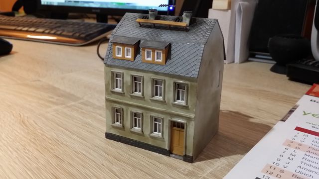 pour ce soir maison terminée et patinage effectuée pour le vieillissement de la bâtisse, sera mis en place demain sur le module et surprise encore un bâtiment à fabriquer le irish pub et oui dans le village faut bien un pub